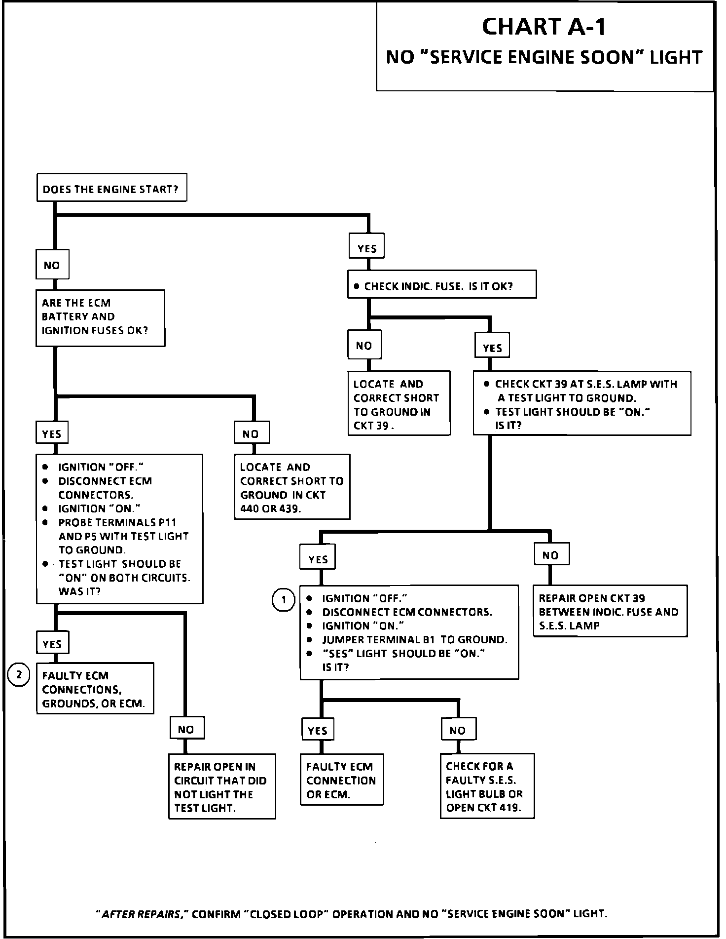 There should always be a steady "SERVICE ENGINE SOON" light when the ignition is "ON" and engine stopped. Ignition voltage is supplied to the light bulb. The ECM will control the light and turn it "ON" by providing a ground path through CKT 419.