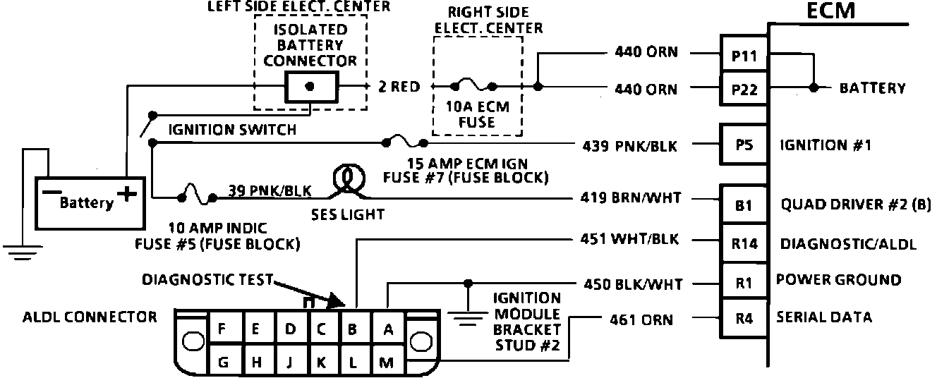 2. Using a test light connected to 12 volts, probe each of the system ground circuits to be sure a good ground is present. See ECM CONNECTOR IDENTIFICATION in ELECTRICAL AND ELECTRONIC DIAGRAMS for ECM pin locations of ground circuits.