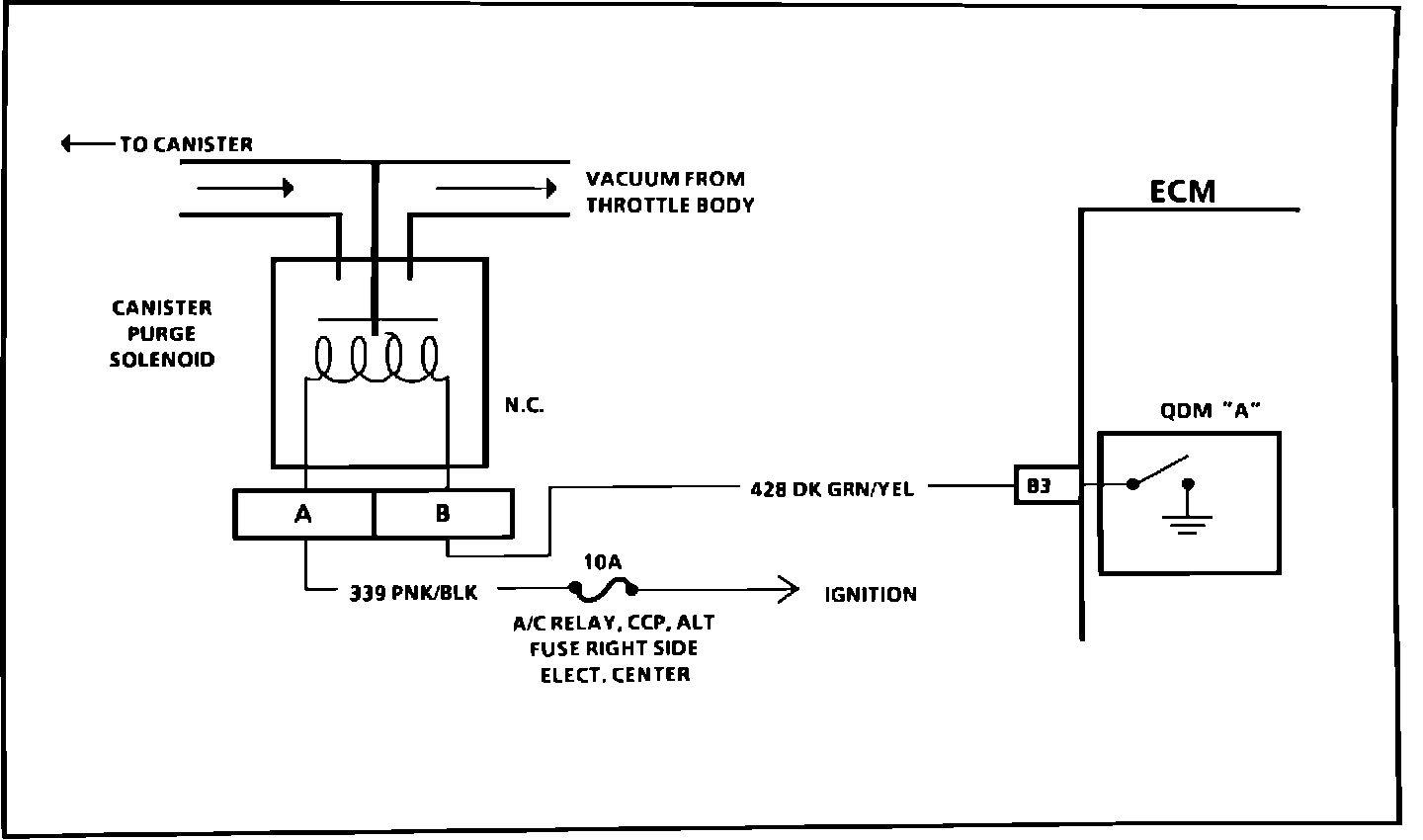 The canister purge is controlled by a solenoid that allows ported vacuum to purge the fuel vapor canister when energized. The ECM controls the ground to power the solenoid. If the diagnostic test terminal is grounded, with the engine not running, or the following exist while the engine is running, the purge solenoid is energized: