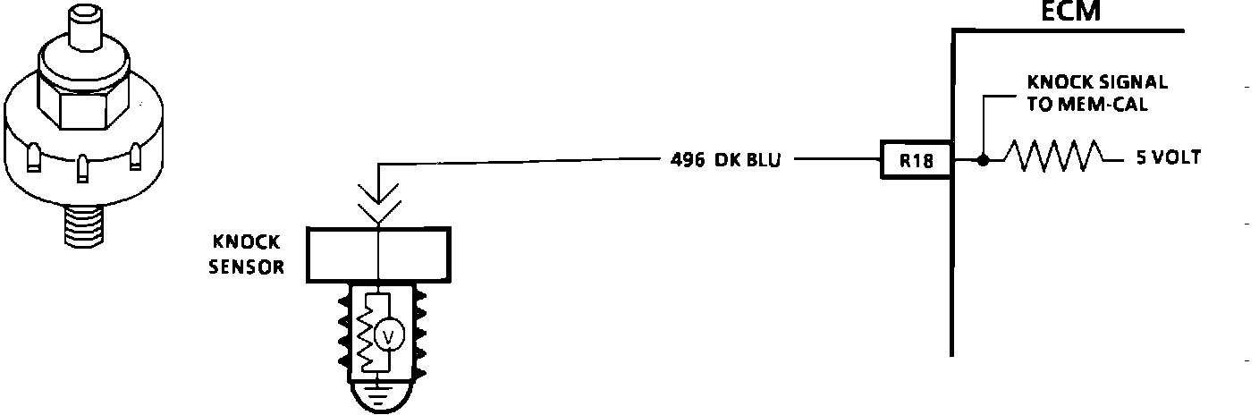 The knock sensor is used to detect engine detonation and the ECM will retard the electronic spark timing based on the signal being received, The circuitry within the knock sensor causes the ECM's supplied 5.0 volt signal to be pulled down so that under a no knock condition, CKT 496 would measure about 2.5 volts.