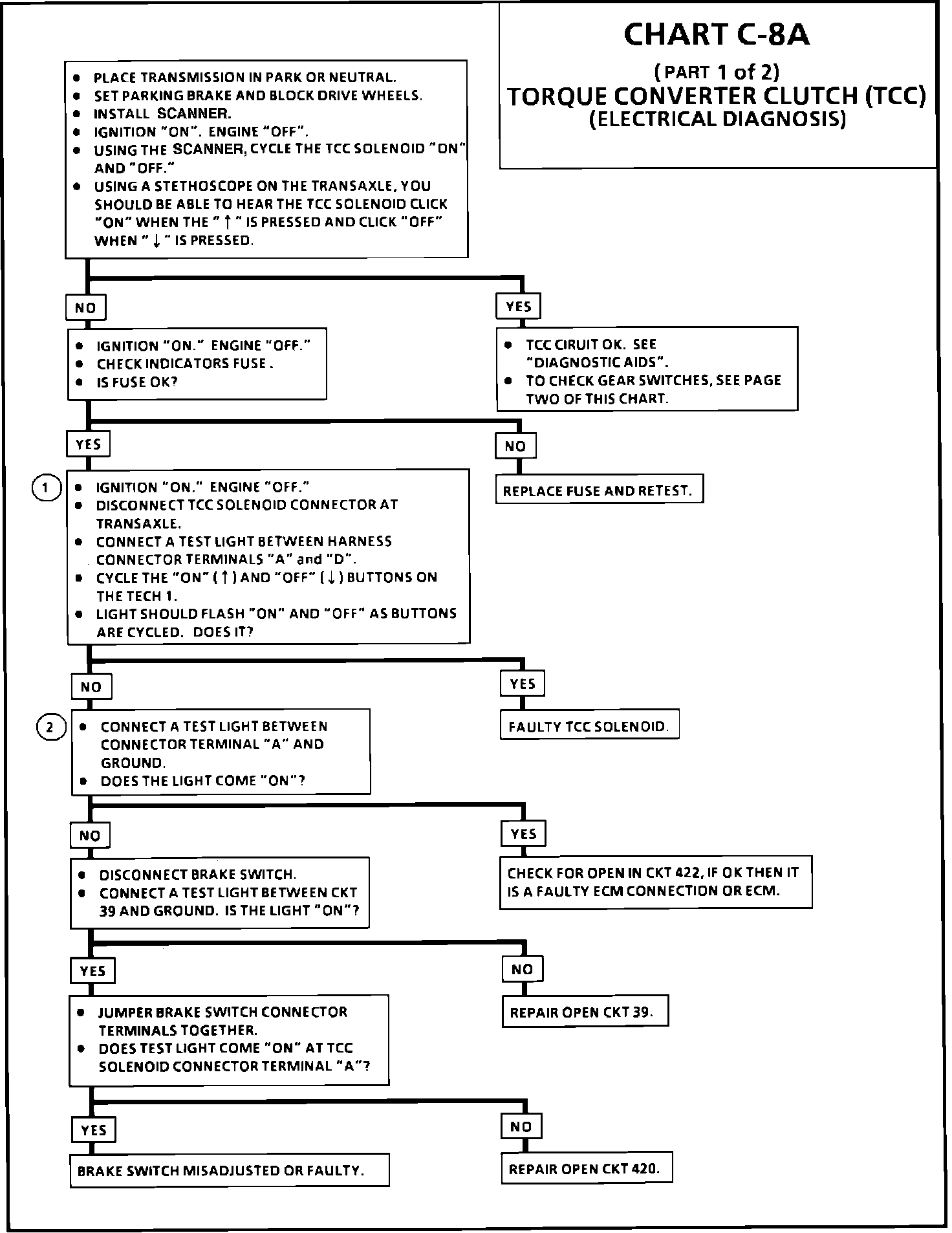 2. Checks fuse, brake switch and circuits 39 and 420 to the TCC solenoid.