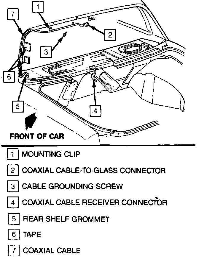 - Check the coax cable ground at the roof inner by gently pulling the headliner back at the rear glass. Reattach the ground terminal if needed. See illustration.