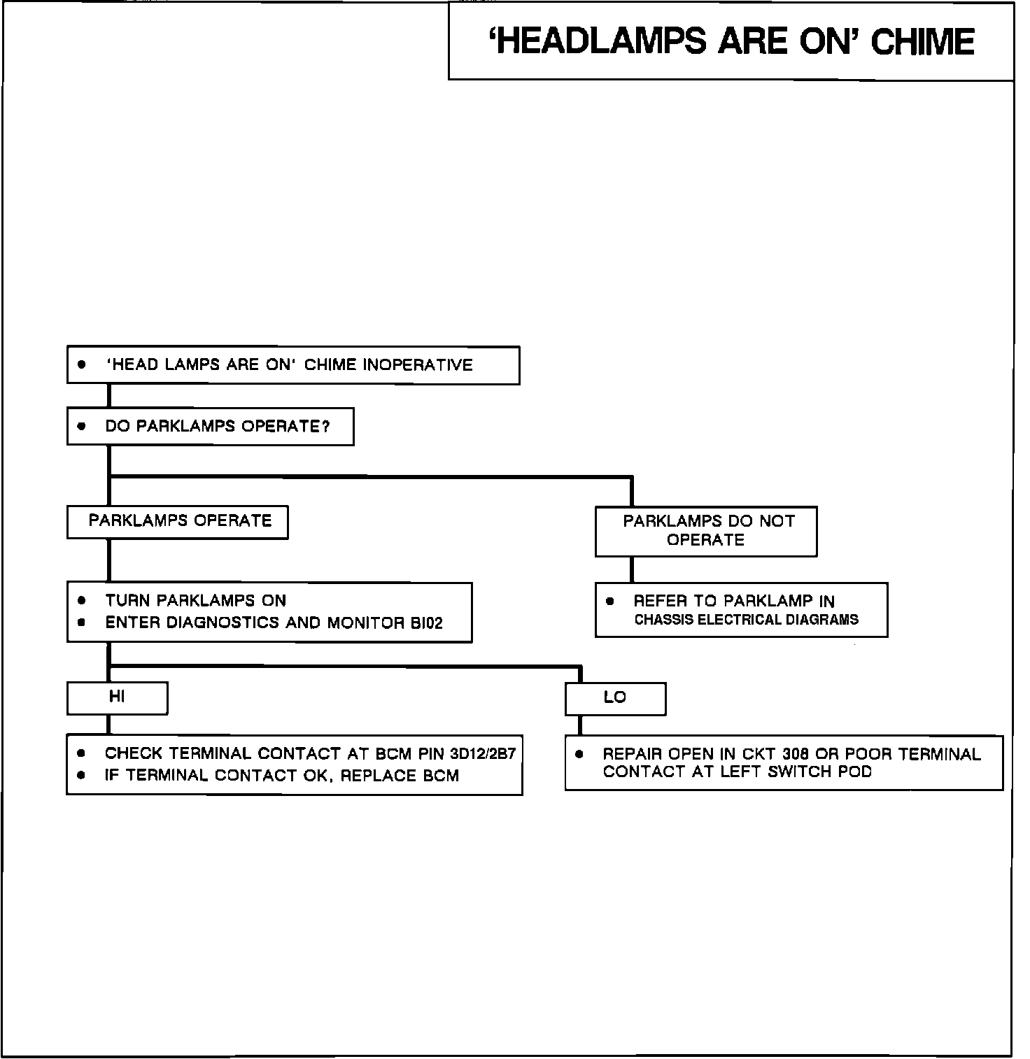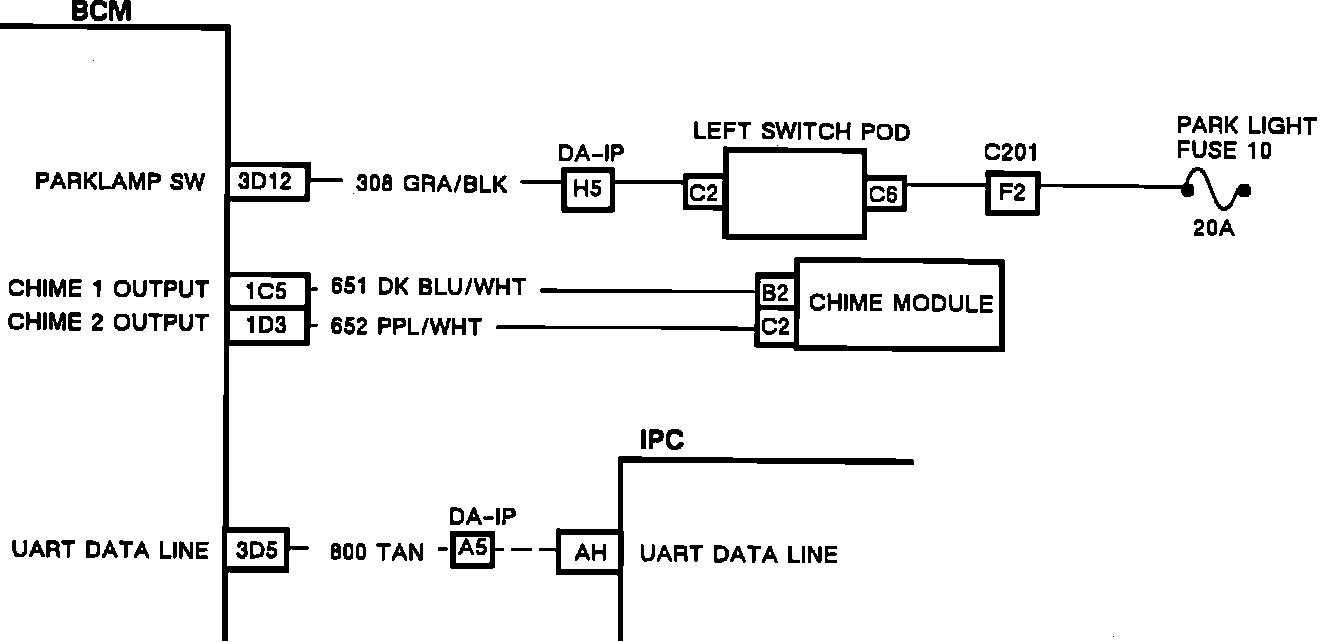 The Park Light fuse #10 provides system voltage to the park light switch in the left switch pod. When the parklamp switch is closed, it sends voltage to the BCM. The BCM internally monitors the voltage level of the park light circuit at pin 3D12. When the parklamp switch is open the BCM will detect 0 volts, but if the park light switch is closed (the parklamps/headlamps are turned "ON"), the BCM will detect system voltage at pin 3D12. Once the BCM has determined that all of the failure conditions have been met, it will turn "ON" the fast paced chime on the chime module and the "LIGHTS ON" indicator on the IPC.