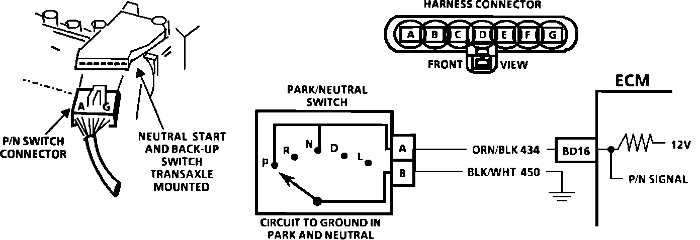 The Park/Neutral Switch contacts are a part of the Neutral Start Switch and are closed to ground in park or neutral and open in drive ranges and reverse.