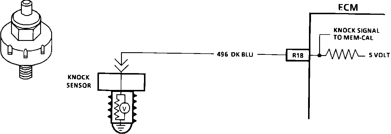 The knock sensor is used to detect engine detonation and the ECM will retard the electronic spark timing based on the signal being received. The circuitry, within the knock sensor, causes the ECM's 5 volts to be pulled down so that under a no knock condition, CKT 496 would measure about 2.5 volts. The knock sensor produces an A/C signal, which rides on the 2.5 volts DC voltage. The amplitude and frequency are dependent upon the knock level.