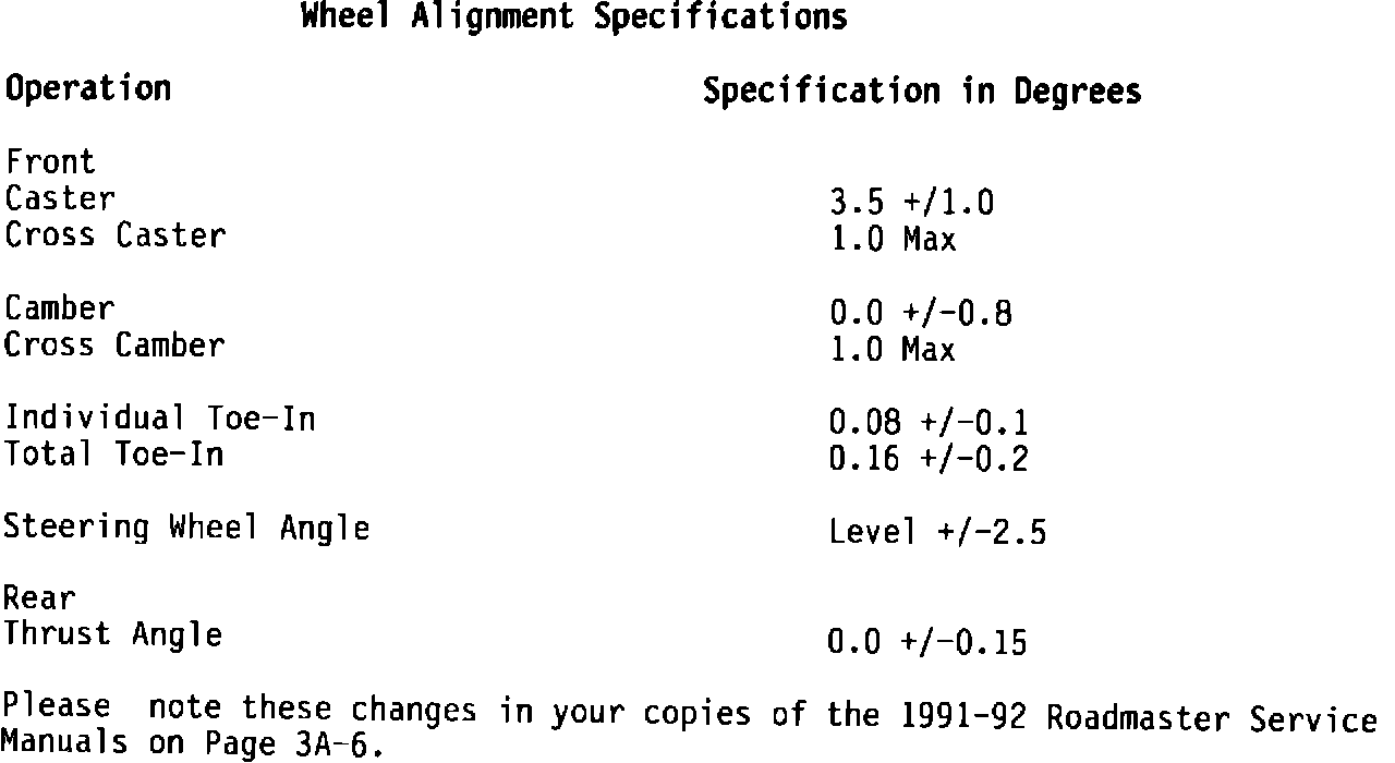 SERVICE MANUAL UPDATE - SECTION 3A-6 WHEEL ALIGNMENT SPECIFICATIONS (CAMBER SPECS CHANGED)