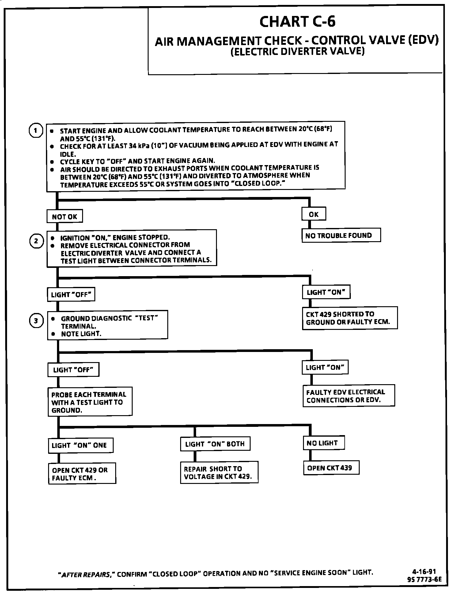1. If the EDV does not have 10" Hg (34 kPa) of vacuum applied to the valve, inspect for a pinched, plugged, or a leak in the vacuum hose. The ECM should energize the EDV at idle when the coolant temperature is between 20°C (68°F) and 50°C (131°F) and system not in "closed loop." At high rpm between approximately 2000-2500 rpm, the ECM will power off the EDV which will divert air to the atmosphere.
