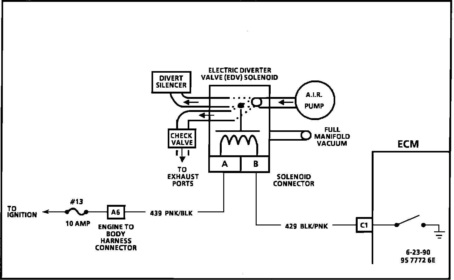 An electric air control valve solenoid directs air into the exhaust ports, or to atmosphere. Air is directed into the exhaust ports whenever the engine is started and the coolant temperature is above 20°C (68°F) and below 55°C (131°F) and the system is in "open loop" and engine speed is below 1900 rpm. When the vehicle is started and the coolant temperature is below about 20°C (68°F), the air will be diverted to the atmosphere for the entire key cycle.