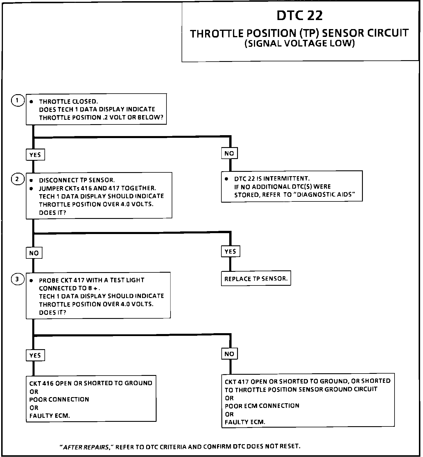 NOTE: If DTC 22 is set, the ECM will use a fail-soft value for TP sensor of about 3% throttle angle. The scan tool will continue to display actual sensor value.