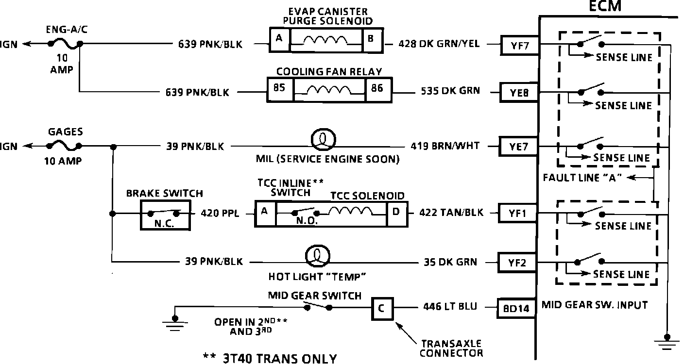 Quad-Driver Modules (QDM) are used to control the components shown in the illustration above. When the ECM is commanding a component "ON," the QDM closes the switch completing the circuit to ground. Each QDM output has a sense line. When a component is commanded "ON," the voltage potential on the sense line is low, and when the component is commanded "OFF" the voltage potential on the sense line is high. DTC 26 will set when the ECM is commanding a component "ON" and the voltage potential on a QDM "A" sense line is high, or if the component is commanded "OFF" and the voltage potential on a QDM "A" sensor line is low. Either of these conditions will cause the QDM "A" fault line to display HIGH and set DTC 26. On all vehicles, the QDM "A" fault status on the scan tool will display HIGH with the brake applied or if the engine is not running. On vehicles with a 3T40 transmission, the QDM "A" fault status on the scan tool will read HIGH until the TCC in-line switch is closed. These conditions will not cause DTC 26 to set even though the fault line displays HIGH. To simulate driving in second gear and change the QDM status to low, disconnect TCC connector and connect a test light between harness terminals "A" and "D."