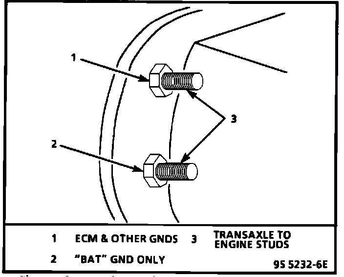 NOTE: The ECM ground must be located on the transaxle to engine stud as shown in Figure. If the ECM ground was on the "battery" ground stud, a high current ground could create transient sensor values to the ECM.