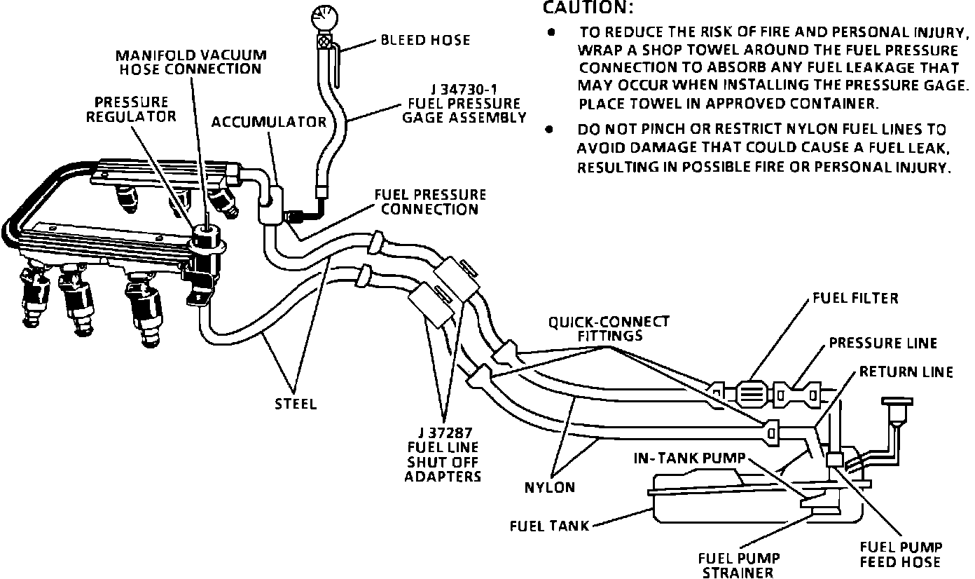 7. Restricting the fuel return line causes fuel pressure to build above regulated pressure. With battery voltage applied to the pump test connector, pressure should rise above 325 kPa (47 psi) as the valve in the return line is partially closed.
