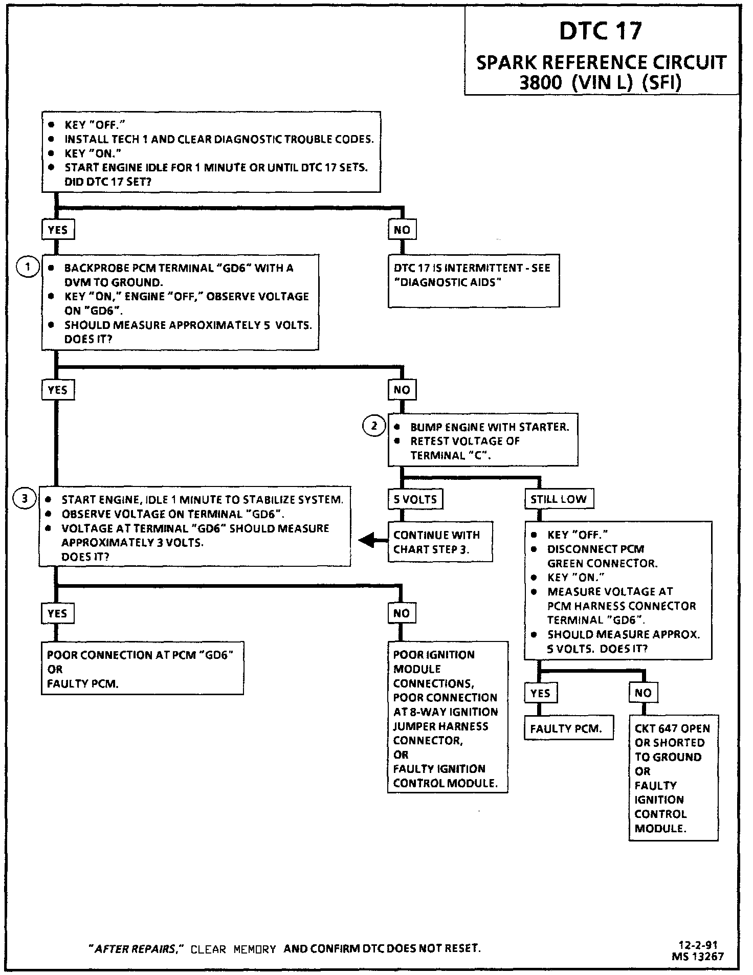 The spark reference signal (CKT 647) is used by the PCM to improve ignition timing accuracy during crank and at engine speeds of up to 1200 rpm. The spark reference allows the use of EST mode below 400 rpm, eliminating the need to utilize bypass mode during start-up, and also allows the PCM to calculate true crankshaft position in 1/6 the time that use of the fuel control reference signal would permit. During normal operation, the PCM uses the spark reference signal to control ignition timing until the engine speed exceeds 1200 rpm, at which time the fuel control reference signal (CKT 430) is used. When conditions for setting code 17 exist, the fuel control reference signal is used by the PCM to enable and control EST. This condition will cause bypass mode to be used for ignition timing below 400 rpm and EST ignition timing to be degraded below 1200 rpm. Code 17 does not turn on the Malfunction Indicator Light (MIL).