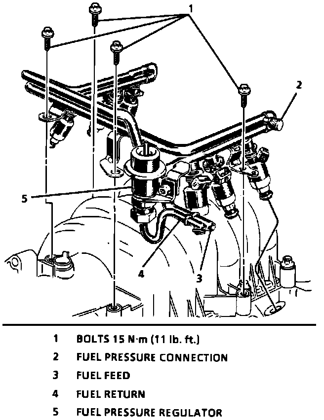 5. Remove the four bolts securing the fuel rail assembly to the intake manifold.