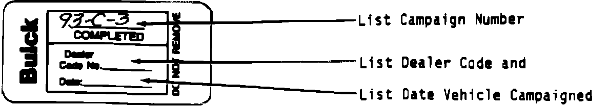 Each vehicle corrected in accordance with the instructions outlined in this campaign will require a "Campaign Identification Label." Each label provides a space to include the campaign number and the five digit dealer code of the dealer performing the campaign service. This information may be inserted with a typewriter or ball point pen.