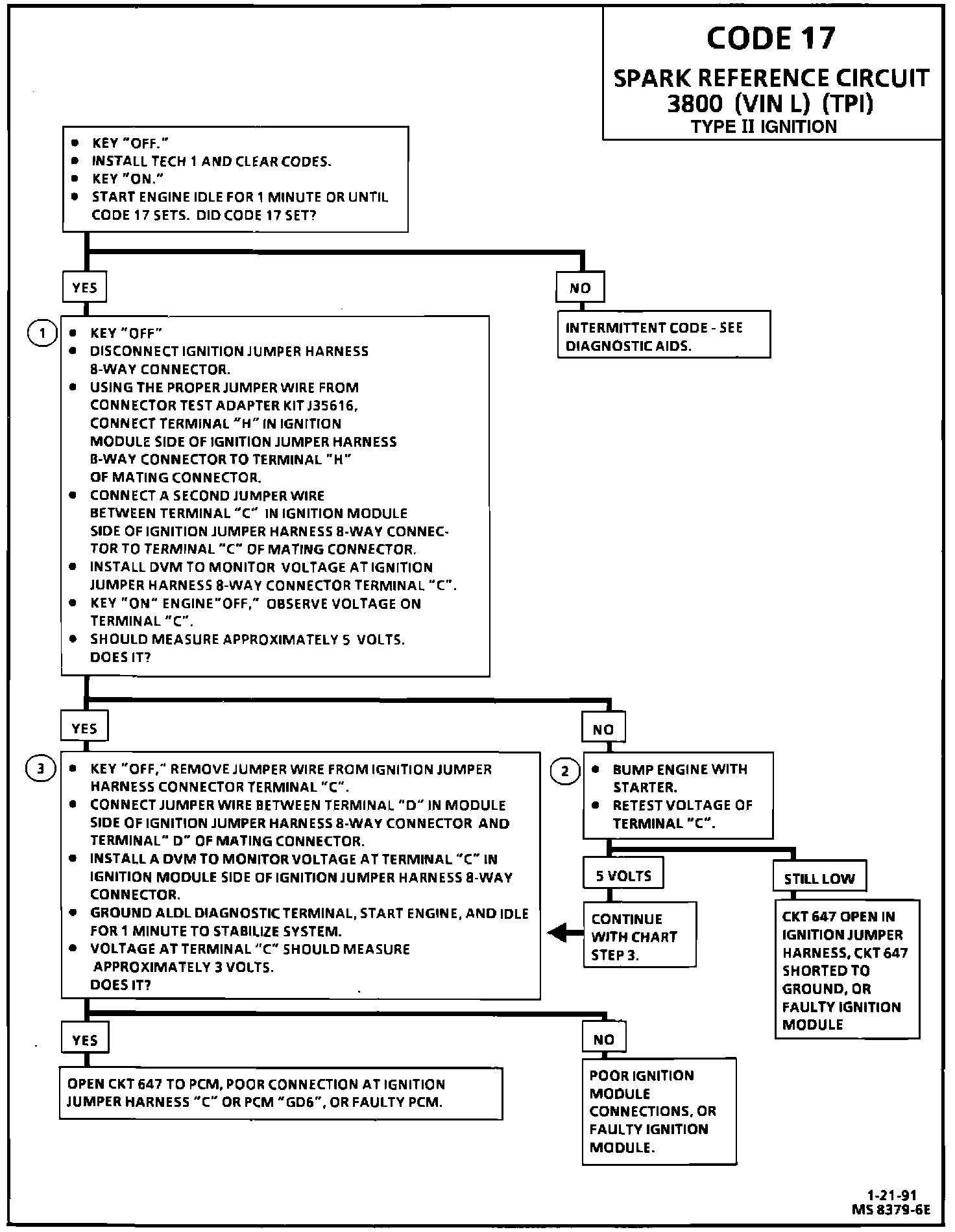 The spark reference signal (CKT 647) is used by the PCM to improve ignition timing accuracy during crank and at engine speeds of up to 1200 rpm. The spark reference allows the use of EST mode below 400 rpm, eliminating the need to utilize bypass mode during start-up, and also allows the PCM to calculate true crankshaft position in 1/6 the time that use of the fuel control reference signal would permit. During normal operation, the PCM uses the spark reference signal to control ignition timing until the engine speed exceeds 1200 rpm, at which time the fuel control reference signal (CKT 430) is used. When conditions for setting code 17 exist, the fuel control reference signal is used by the PCM to enable and control EST. This condition will cause bypass mode to be used for ignition timing below 400 rpm and EST ignition timing to be degraded below 1200 rpm. Code 17 does not turn on the SERVICE ENGINE SOON light.