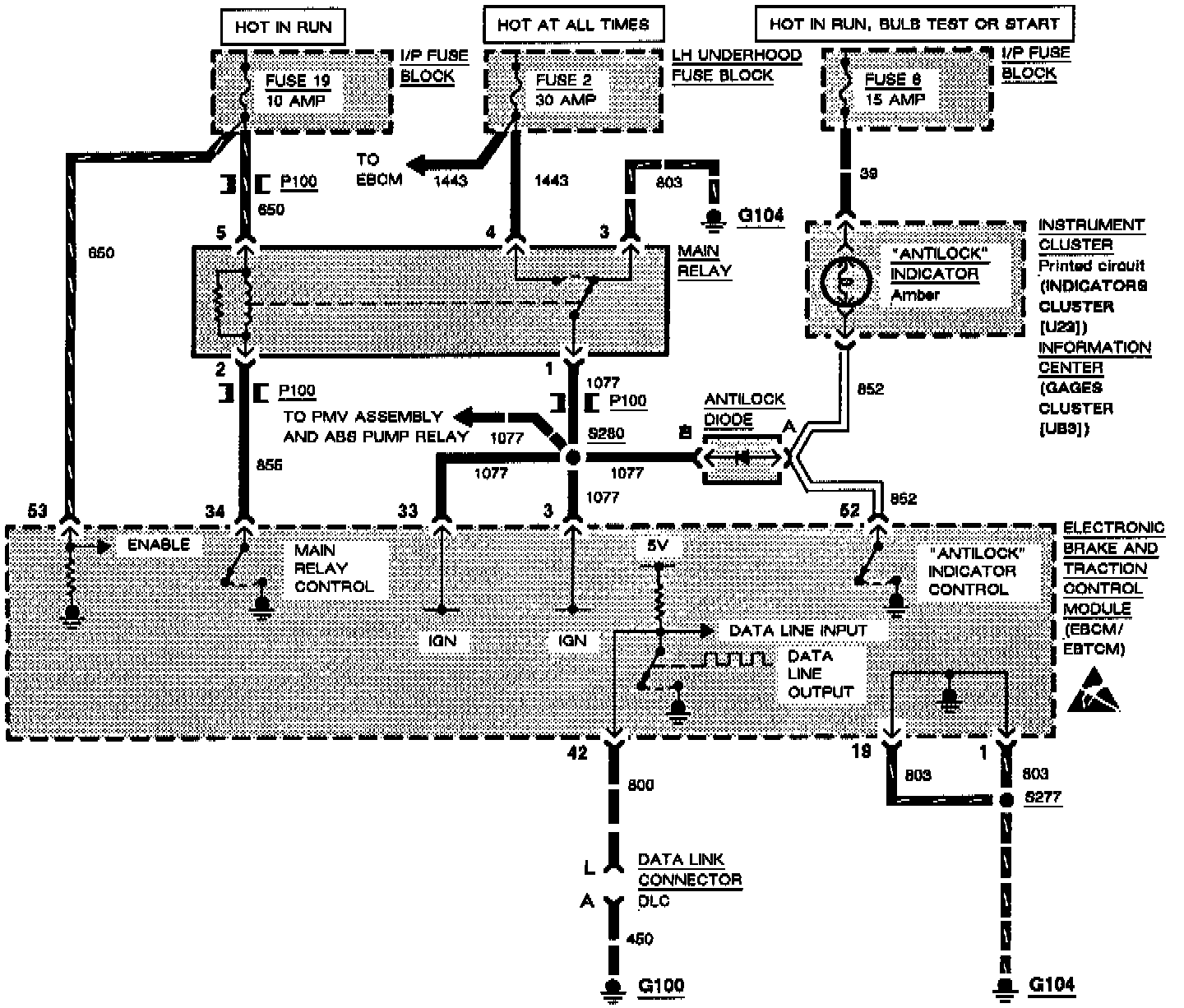 When the EBCM/EBTCM is disabled for any reason (i.e. open fuse 19), the main relay is de-energized. This provides an ANTILOCK indicator ground path through the antilock diode and main relay contacts, and causes the indicator to light with no codes being set.
