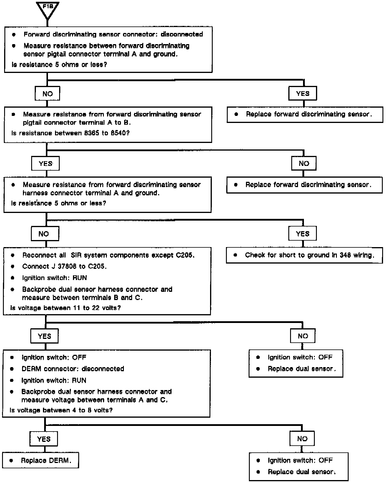 The DERM tests the deployment loop (both sensors, inflator module, ignition feed, and reserve power supply) by measuring voltage through the resistor module. The DERM stores one of the codes if it senses an out of range condition. Each of the codes is set when a particular condition is detected.