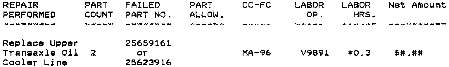 For Campaign Administrative Allowance, add 0.1 hours to the "Labor Hours". The "Parts Allowance" should be the sum total of the current GMSPO Dealer Net price plus 30% of all parts required for the repair. The amount identified in the "Net Amount" column should represent the sum of the current GMSPO Dealer Net price plus 30% for one pint of DEXRON III or DEXRON IIE Automatic Transmission Fluid used to perform the required repairs.