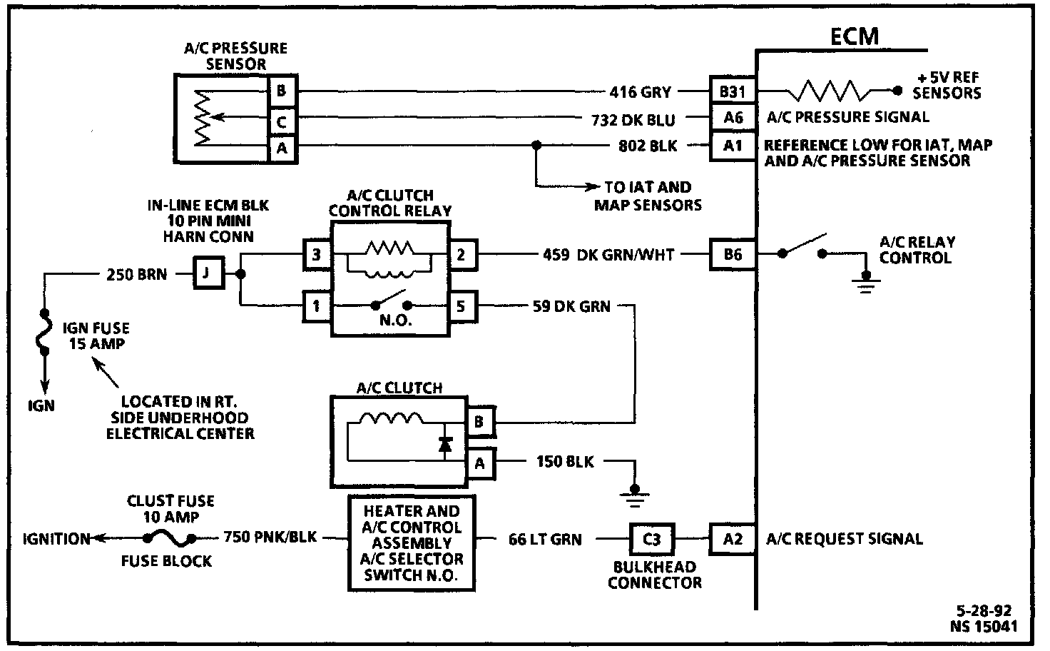 The A/C pressure sensor responds to changes in A/C refrigerant system high side pressure. This input indicates how much load the A/C compressor is putting on the engine and is one of the factors used by the ECM to determine IAC A/C valve position of idle speed control. The circuit consists of a 5 volts reference and a ground, both provided by the ECM, and a signal line to the ECM. The signal is a voltage which is proportional to the pressure. The sensor's range of operation is 0 to 450 psi. At 0 psi, the signal will be about .1 volt, varying up to about 4.9 volts at 450 psi or above. DTC 70 sets if the voltage is above 4.9 volts for 5 seconds or more. The A/C compressor is disabled by the ECM if DTC 70 is present or if pressure is above calibrated values described in "ECM Controlled Air Conditioning,".