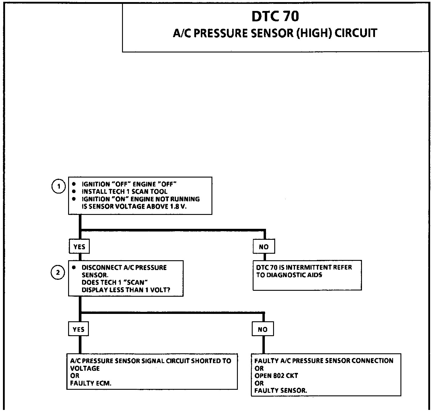 DTC 70 sets when signal voltage falls outside the normal possible range of the sensor and is not due to a refrigerant system problem. If problem is intermittent, check for opens or shorts in harness or poor connections.