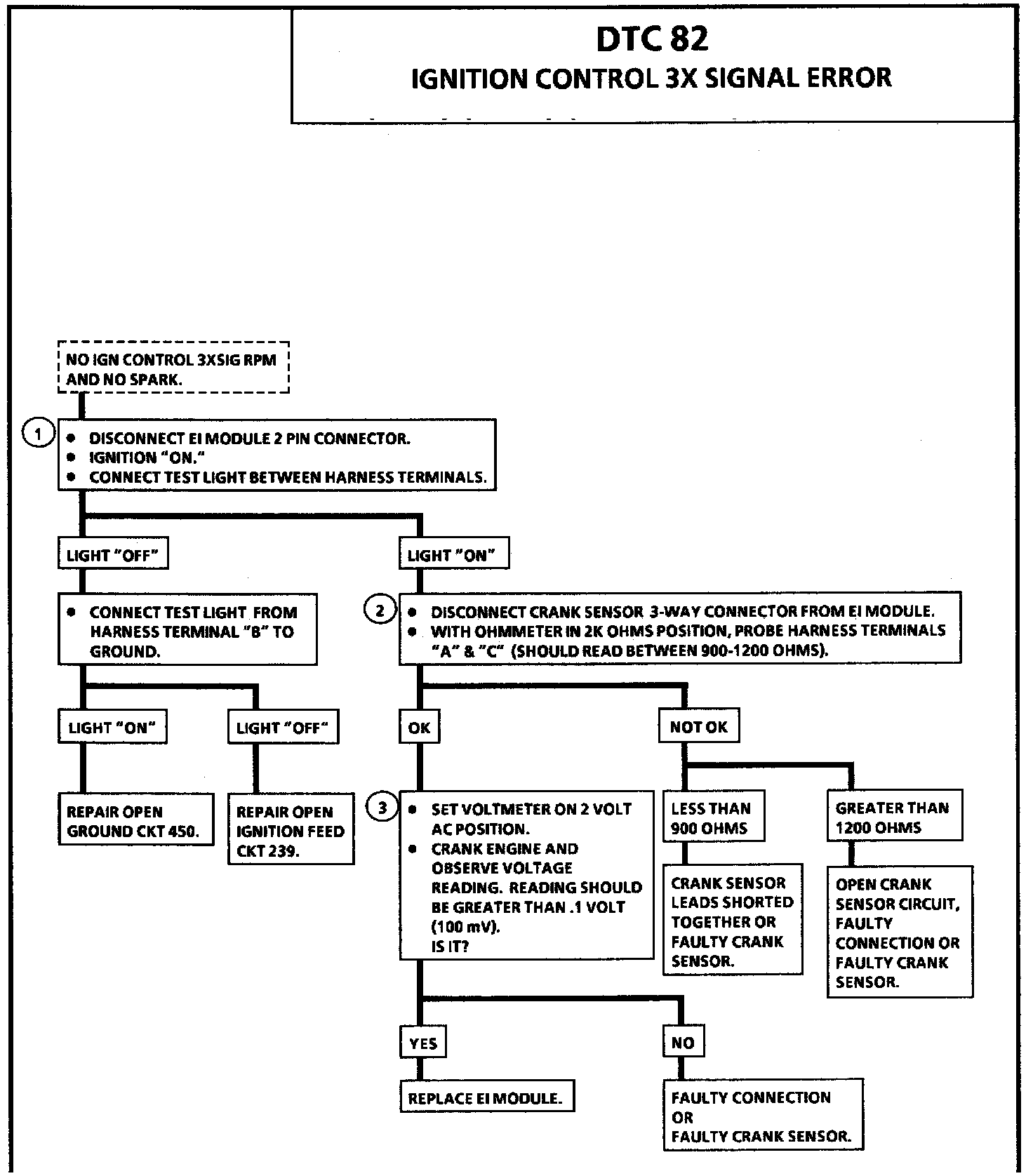 If the Tech 1 (or equivalent) scan tool did not indicate a cranking RPM and there is no spark present at the plugs, the problem lies in the electronic ignition system or the power and ground supplies to the module.
