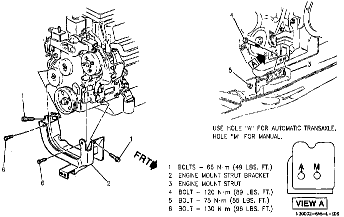 3. Remove bolts attaching the engine mount strut to the body and the engine mount strut bracket.