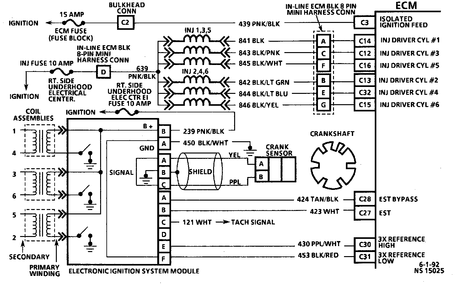 The Electronic Ignition (EI) module monitors the crank sensor signals and based on these signals sends a reference signal to the ECM so that correct spark and fuel injector control can be maintained during all driving conditions.