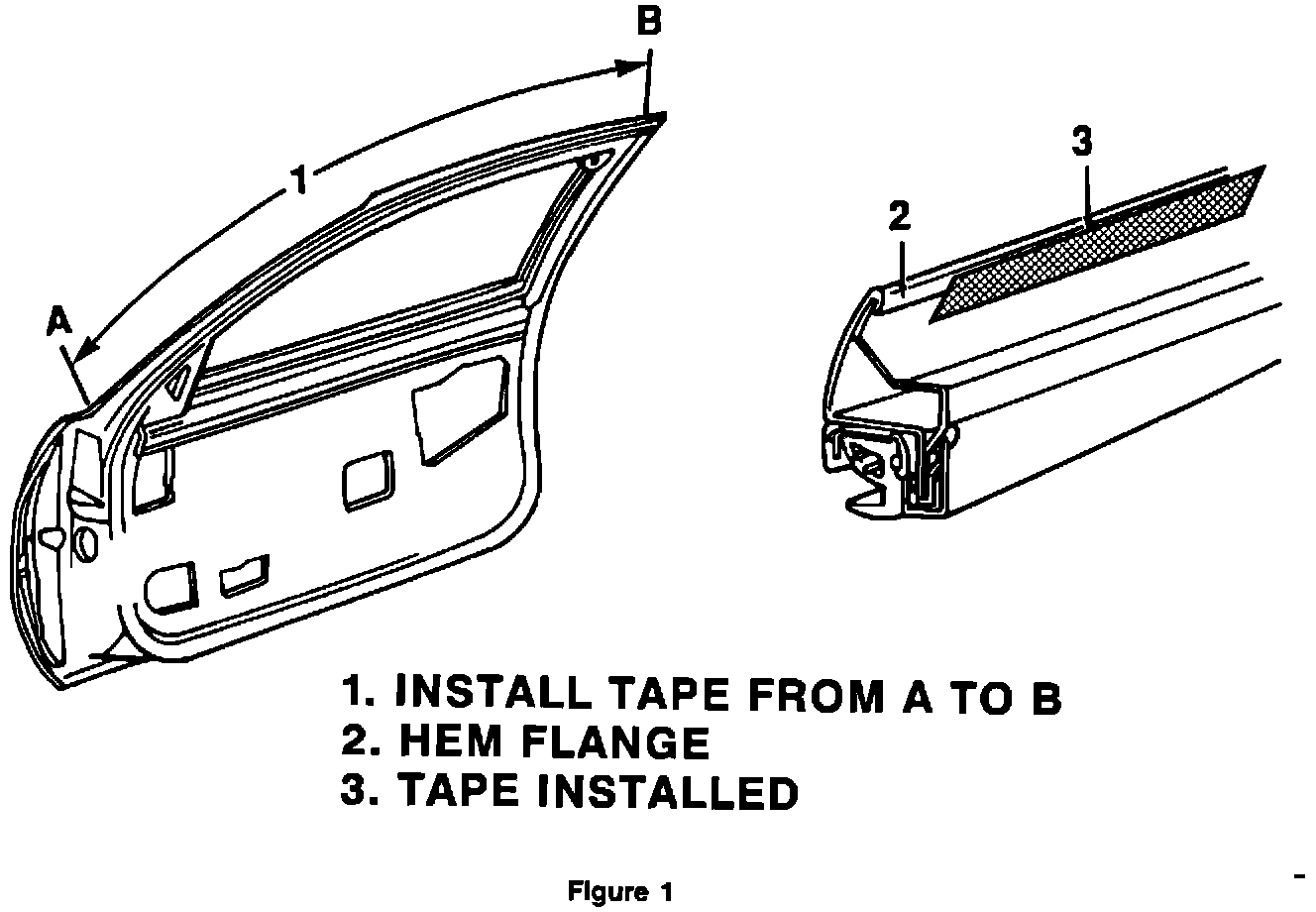 4. Remove protective backing and install the tape to the upper door frame (see Figure 1, Item 1). Make sure the tape overlaps the hem flange (see Figure 1, Item 2). During installation, press the tape firmly into place, working out any air pockets.