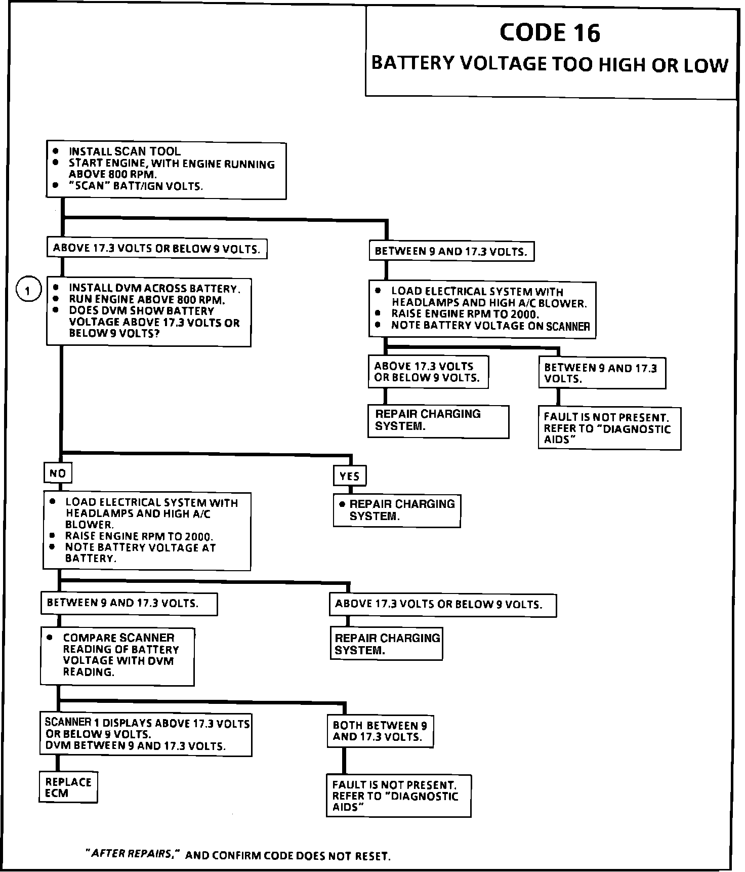The PCM monitors battery or system voltage on CKT 439 to terminal "P5". If the PCM detects voltage above 17.3 volts or below 9 volts for more than 10 seconds, it will turn the SES "ON" and set Code 16 in memory.