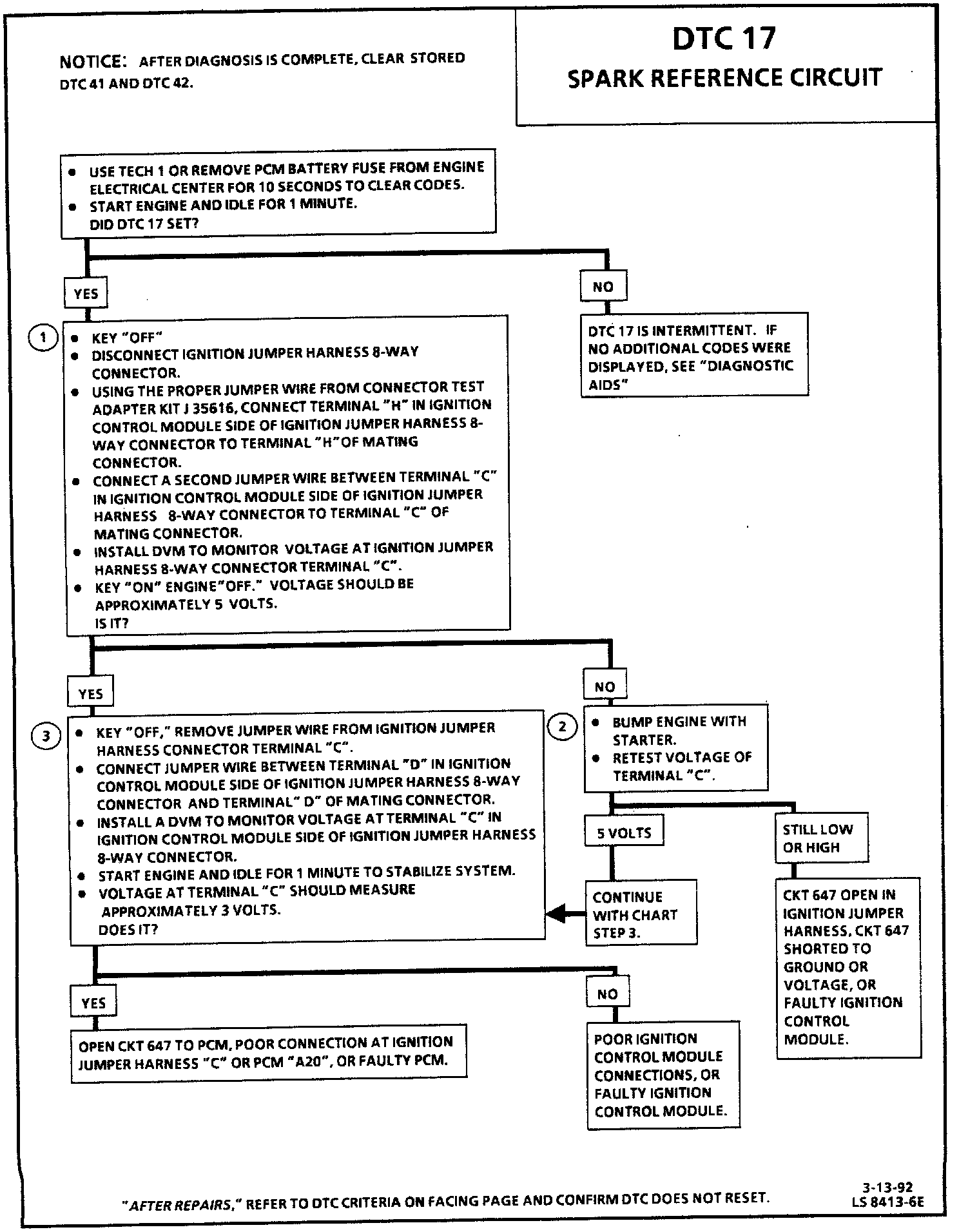 The spark reference signal (CKT 647) is used by the PCM to improve ignition timing accuracy during crank and at engine speeds of up to 1200 rpm. The spark reference allows the use of EST mode below 400 rpm, eliminating the need to utilize bypass mode during start-up, and also allows the PCM to calculate true crankshaft position in 1/6 the time that use of the fuel control reference signal would permit. During normal operation, the PCM uses the spark reference signal to control ignition timing until the engine speed exceeds 1200 rpm, at which time the fuel control reference signal (CKT 430) is used. When conditions for setting code 17 exist, the fuel control reference signal is used by the PCM to enable and control EST. This condition will cause bypass mode to be used for ignition timing below 400 rpm and EST ignition timing to be degraded below 1200 rpm. Code 17 does not turn on the SERVICE ENGINE SOON light.