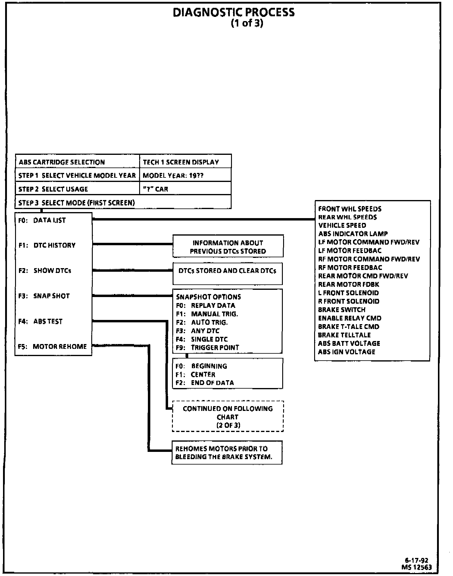 When using the Tech 1 with ABS VI, the last diagnostic trouble code is specifically identified, and specific ABS data is stored at the time of this malfunction. Also, in addition to the last DTC set, there is information about the first five DTCs set. Using the Tech 1, each input and output can be monitored, thus enabling malfunction confirmation and repair verification. Manual control of components and automated functional tests are also available when using the Tech 1.