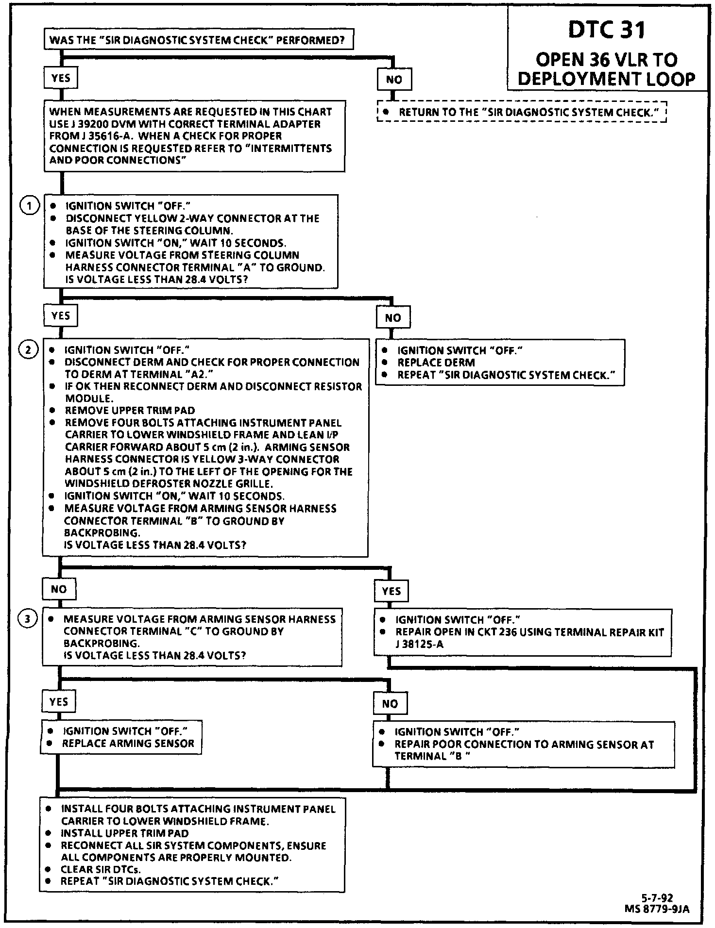 The voltage at the "Sense Low" input, terminal "A6," is within a specific range of "36 VLR" output voltage when "36 VLR" output of the DERM is functional. Should the circuit open between the "36 VLR" output and the arming sensor, "Ignition 1" voltage will be supplying the deployment loop. The voltage at the "Sense Low" input terminal "A6" will decrease due to the lower supply voltage and DTC 31 will set after 700 milliseconds (if DTC 42 is not set). DTC 31 indicates an open in the wiring between the "36 VLR" output of the DERM and the arming sensor.