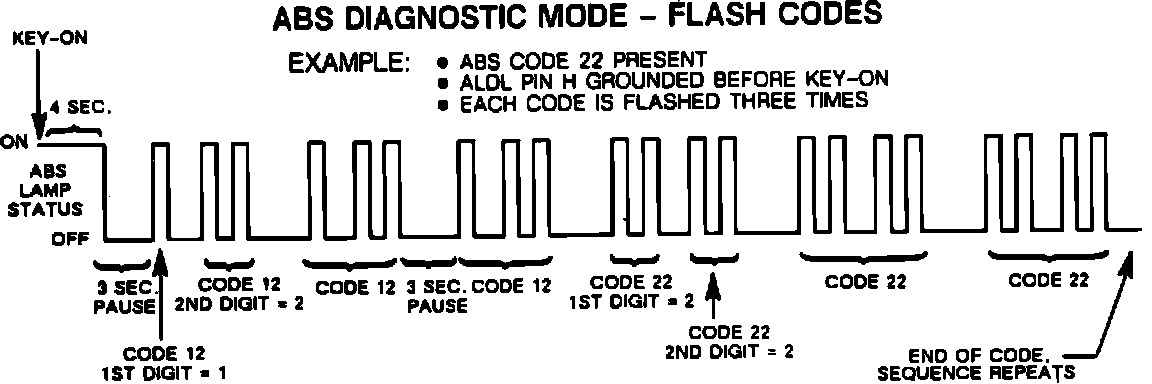 Approximately three seconds after ALDL has been grounded, the EBCM will begin flashing the Anti-Lock Indicator Lamp in flash code sequence. The flash code sequence Fig. 5 will begin with Code 12 flashing three times to signal the beginning of the trouble code display. Each stored code will than be flashed three times. After all codes have been displayed, the sequence will repeat, starting with Code 12.