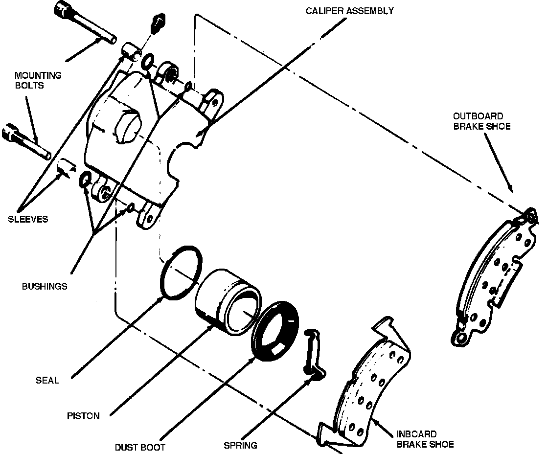 The caliper assembly slides on the mounting bolts. Upon brake application, fluid pressure against the piston forces the inboard shoe and lining assembly against the inboard side of the disc. This action causes the caliper assembly to slide until the outboard lining comes into contact with the disc. As pressure builds up, the linings are pressed against the disc with increased force.