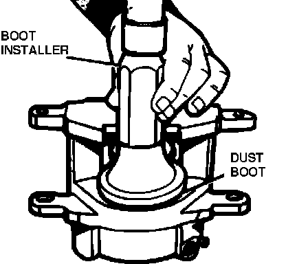 4. Position dust boot in caliper counterbore and install, using suitable seal installer, Fig. 6. Check the boot installation to be sure the retaining ring molded into the boot is not bent and that the boot is installed below the caliper face and evenly all around. If the boot is not fully installed, dirt and moisture may enter the bore and cause corrosion.
