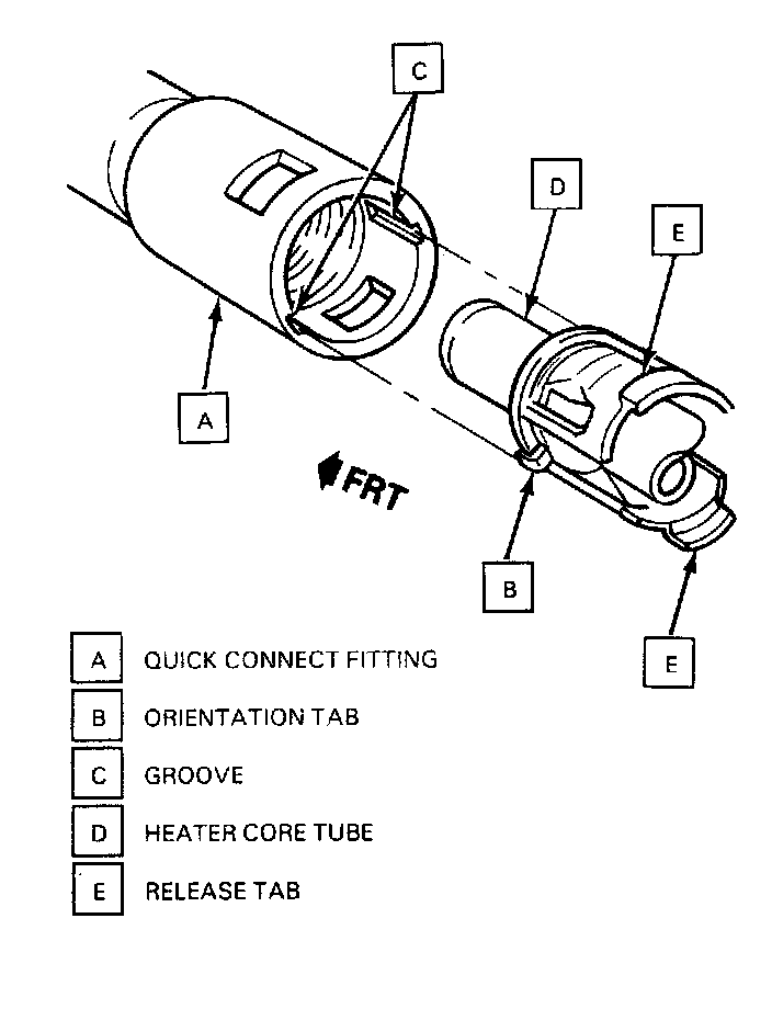 - Release quick connect fittings by squeezing both release tabs at base of heater core tube and pulling on pipe to disengage fitting.