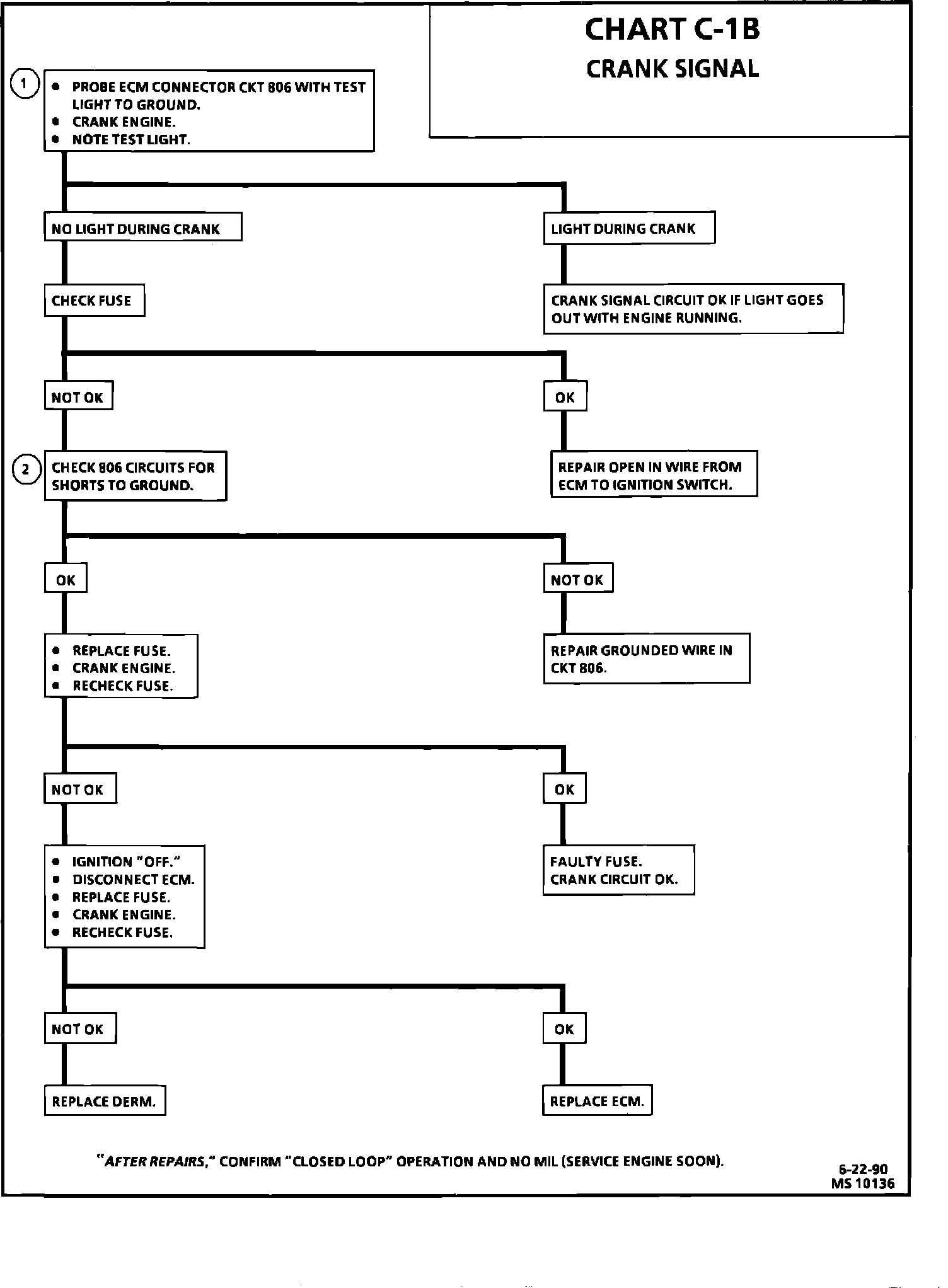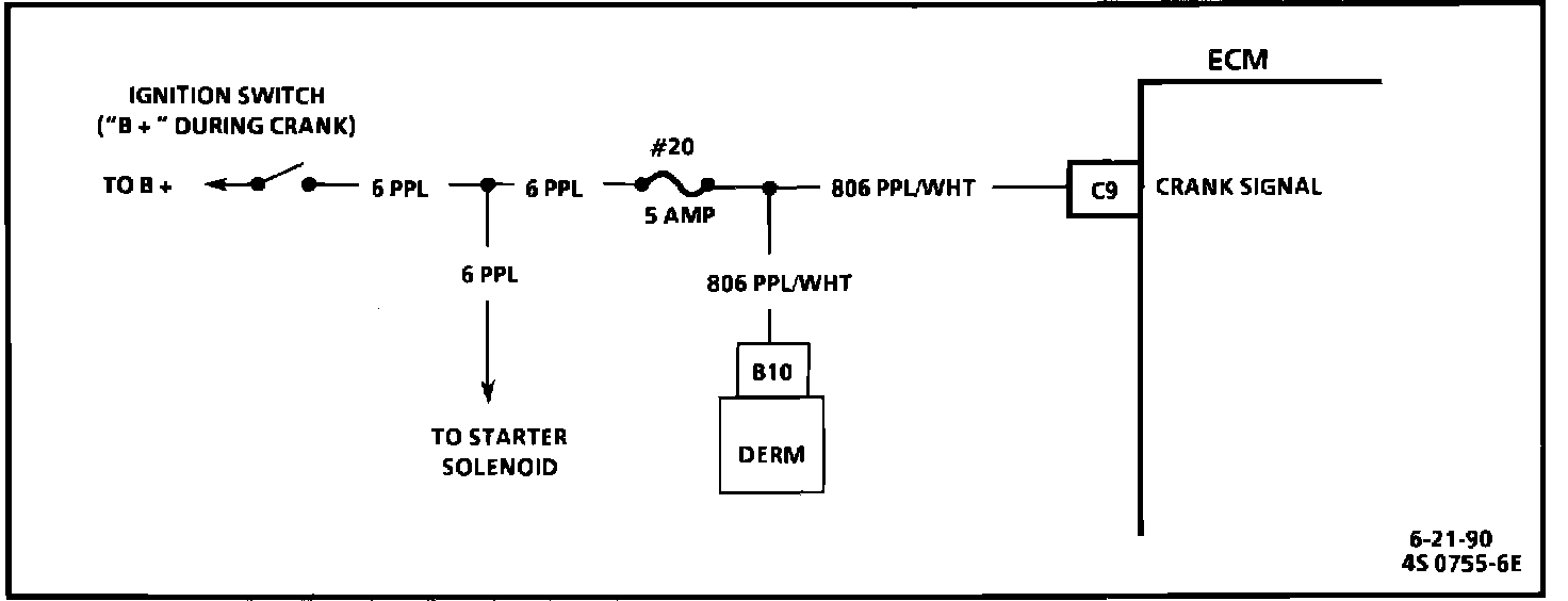 Crank signal is a 12 volt signal to the ECM during cranking to allow enrichment and cancel diagnostics until engine is running. The crank signal is also an input to the Diagnostic Energy Reserve Module (DERM) for the Supplemental Inflatable Restraint (SIR) system. When the DERM senses the engine is being cranked, it will perform a bulb check on the "INFL REST" light.