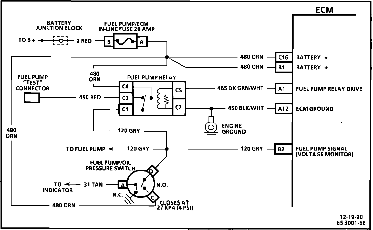 As a back-up system to the fuel pump relay, the fuel pump can also be turned ON by the oil pressure switch. The oil pressure switch is a normally open switch which closes when oil pressure reaches about 28.0 kPa (4.0 psi). If the fuel pump relay fails, the oil pressure switch will power the fuel pump.