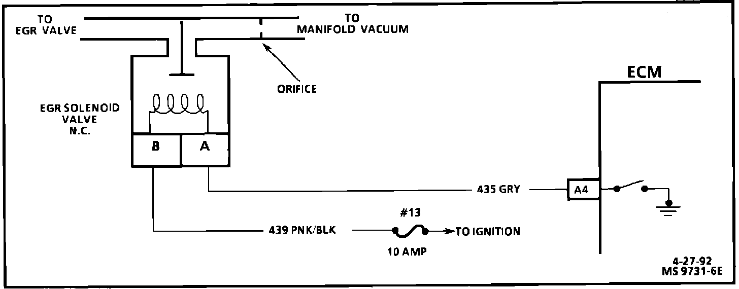 The ECM operates a vacuum solenoid to control the EGR valve. The solenoid is normally closed. The ECM provides a ground path to energize the solenoid. This allows vacuum to flow to the EGR valve.