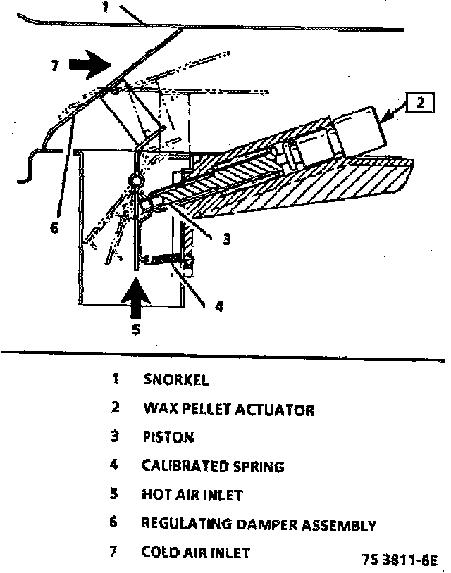 3. Start the engine, and watch the damper door in air cleaner snorkel. When the engine is cold, the damper door should move and close off the outside air. As the air cleaner warms up, the damper door should open slowly to the outside air snorkel.