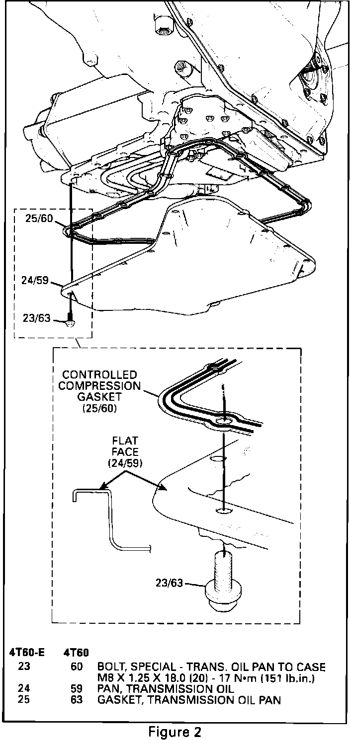 The HYDRA-MATIC 4T60/4T60-E transaxle controlled compression bottom pan gasket (23/63) is reusable. This gasket can be identified by its rubber-like texture and metal frame (black in color). The controlled compression gasket can only be used with a transaxle bottom pan having a flat face along the pan rail.