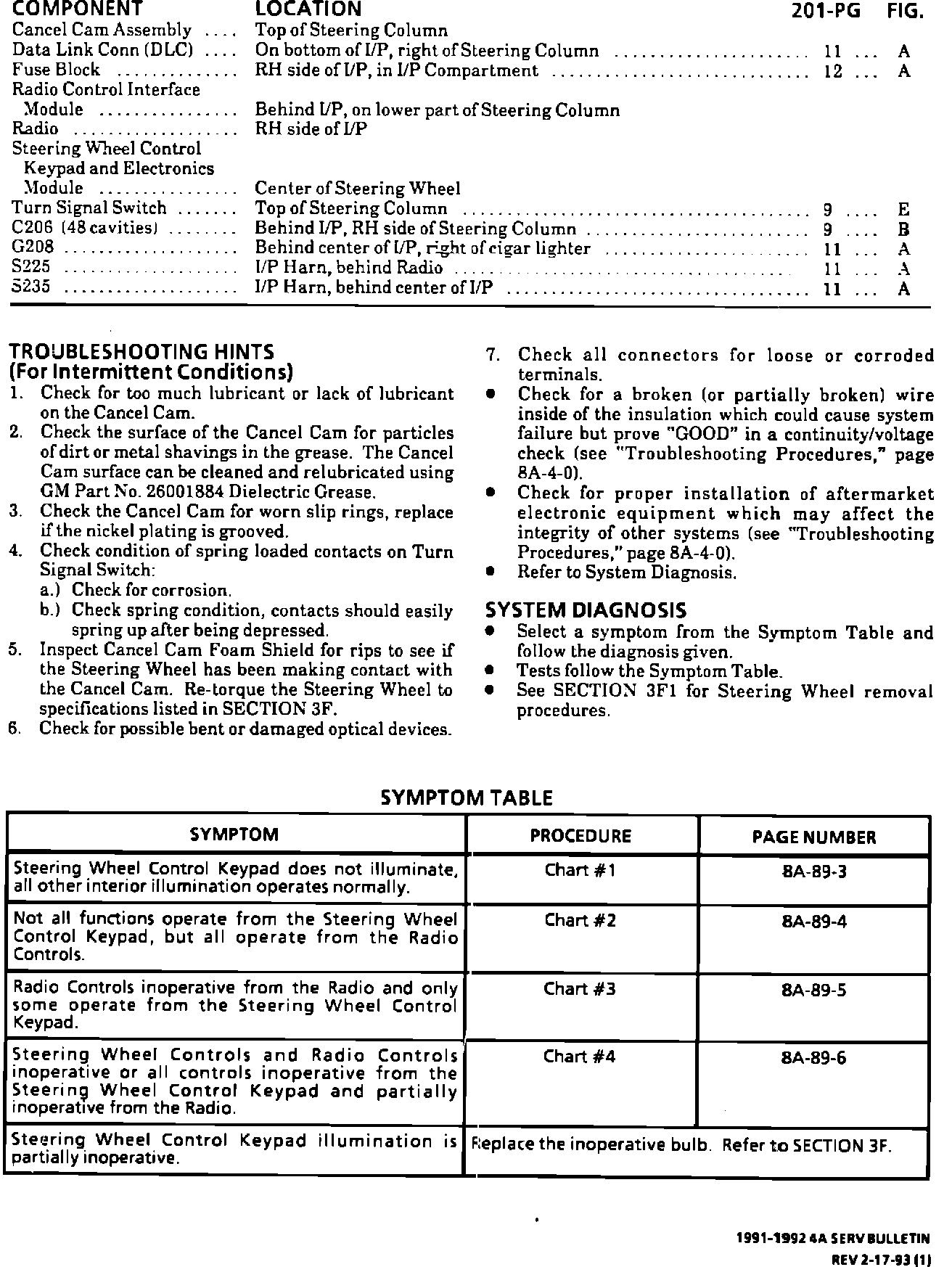 Page 8A-89-2 - Component Location, Troubleshooting and Symptom Table