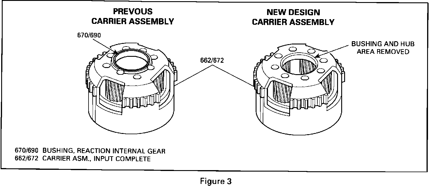 Along with the new dual sprag assembly, a new designed input carrier (662/672) gear set was also implemented. The following components were modified in the input carrier (see Figure 3):