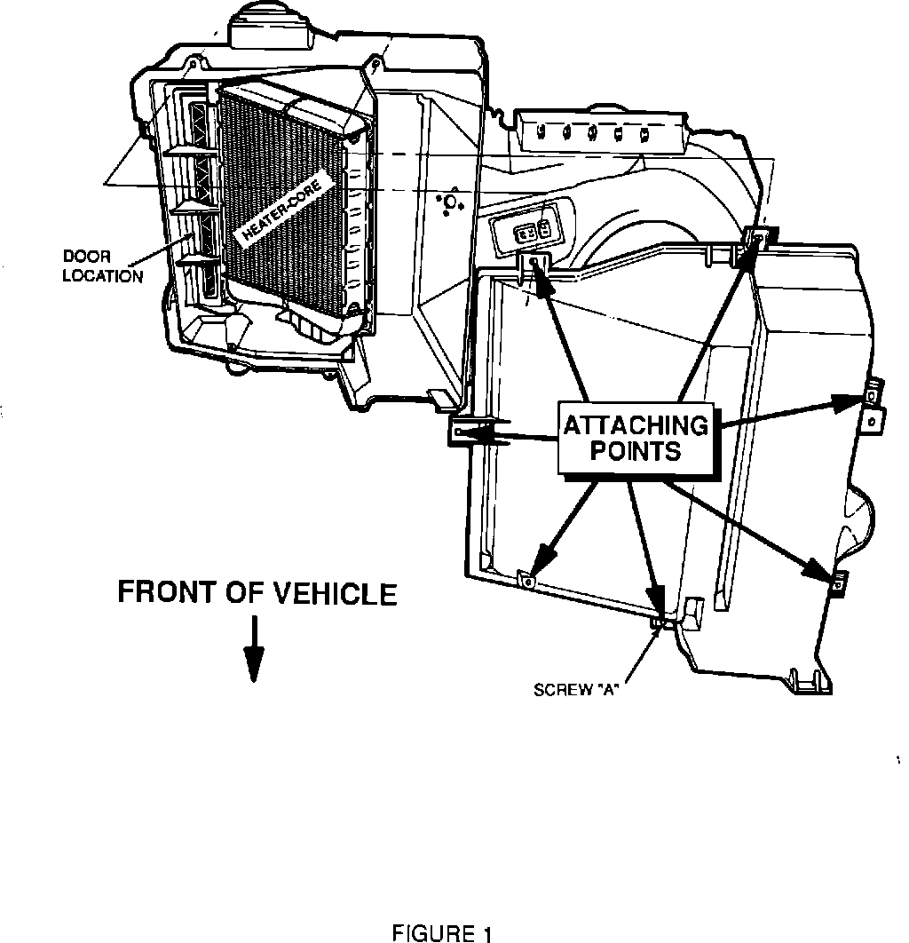 1. Remove A/C Module Lower Evaporator Case per Service Manual, Section 1B. Front screw may be hidden by carpet and difficult to access. Use of a 7 mm flex head socket may be helpful. (See Figure 1 for attaching points.)