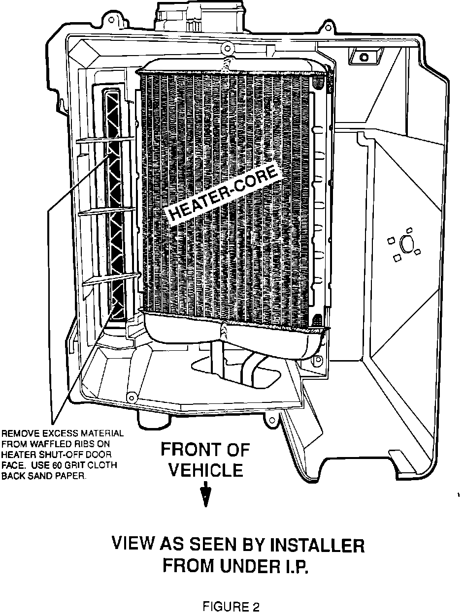 This condition can be induced on manual systems by moving the temperature lever from full cool to full warm repetitively. On automatic systems cycle the temperature selector switch from mid-range to full cool several times. If noise is perceived as described, remove material from waffled ribs on heater shut off door face as outlined in the following procedure.