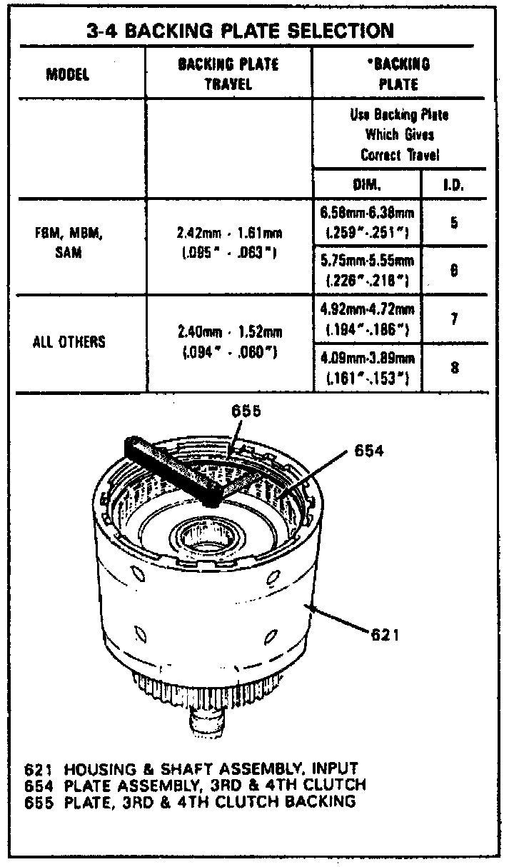 1. Check end clearance between the backing plate and first composition plate with a feeler gauge. The measurement must be taken between the 3rd and 4th clutch plate assembly and the 3rd and 4th clutch backing plate.