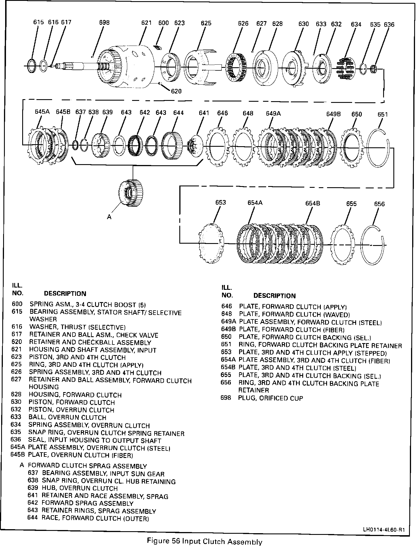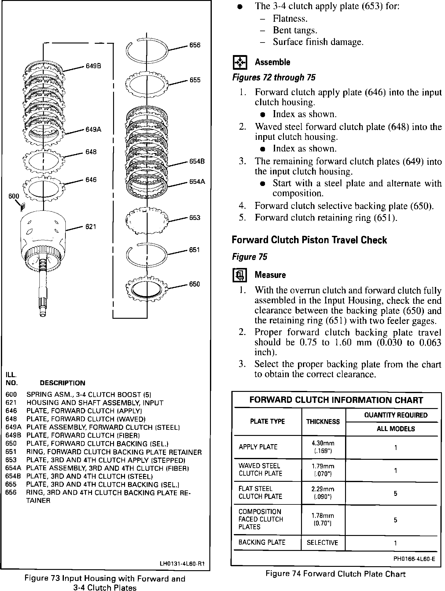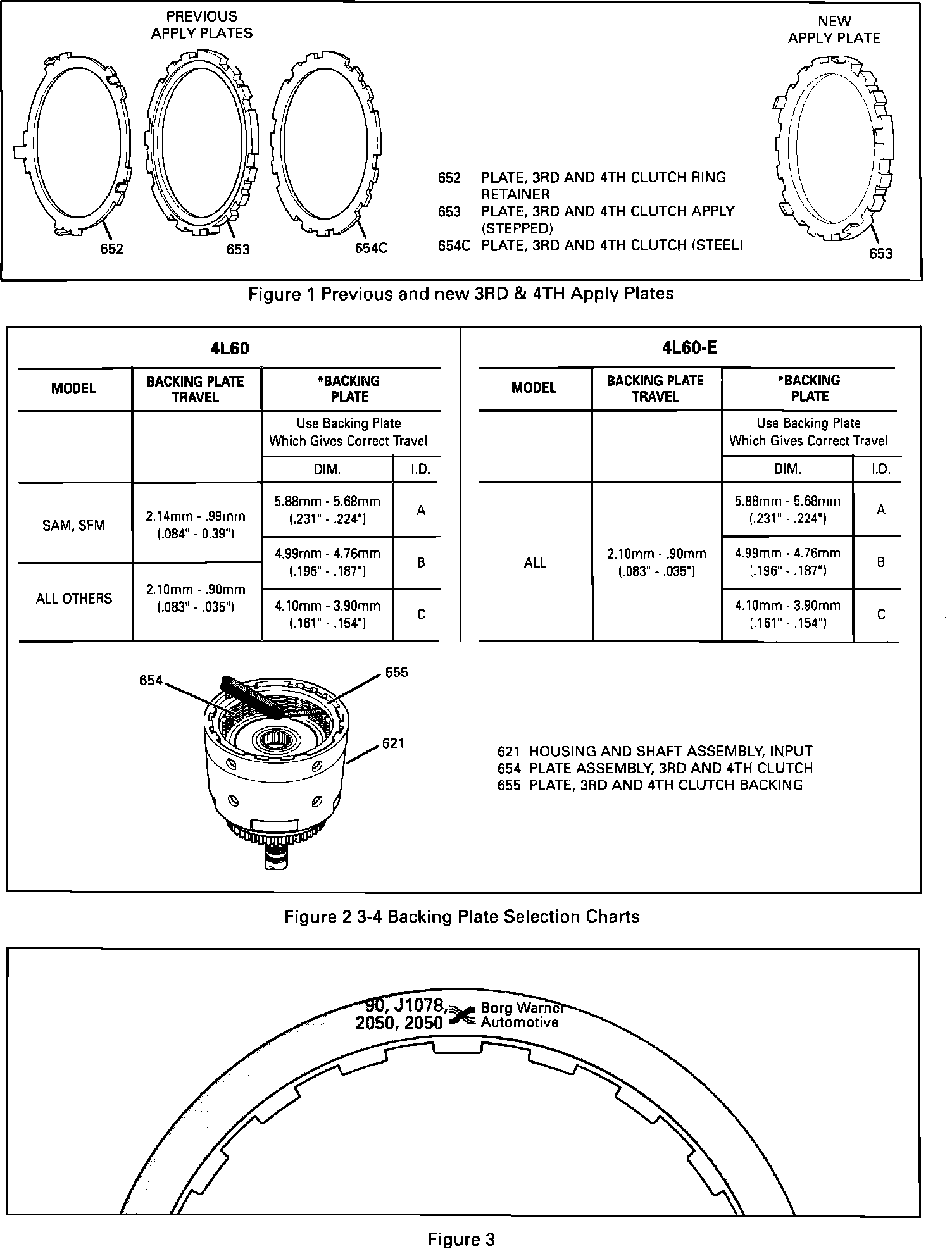 On January 05, 1993 (Julian Date 005) HYDRA-MATIC 4L60 transmissions were built with an improved design 3-4 clutch. The improved design consisted of combining the 3rd and 4th clutch ring retainer plate (Ill. 652), the 3rd and 4th clutch apply (stepped) plate (Ill. 653) and the 3rd and 4th clutch (steel) plate (Ill. 654C) into one 3rd and 4th clutch apply plate (Ill. 653) Figure 1. The 3rd and 4th clutch steel plates are also thicker and the backing plate selection has changed as noted in Figure 2.