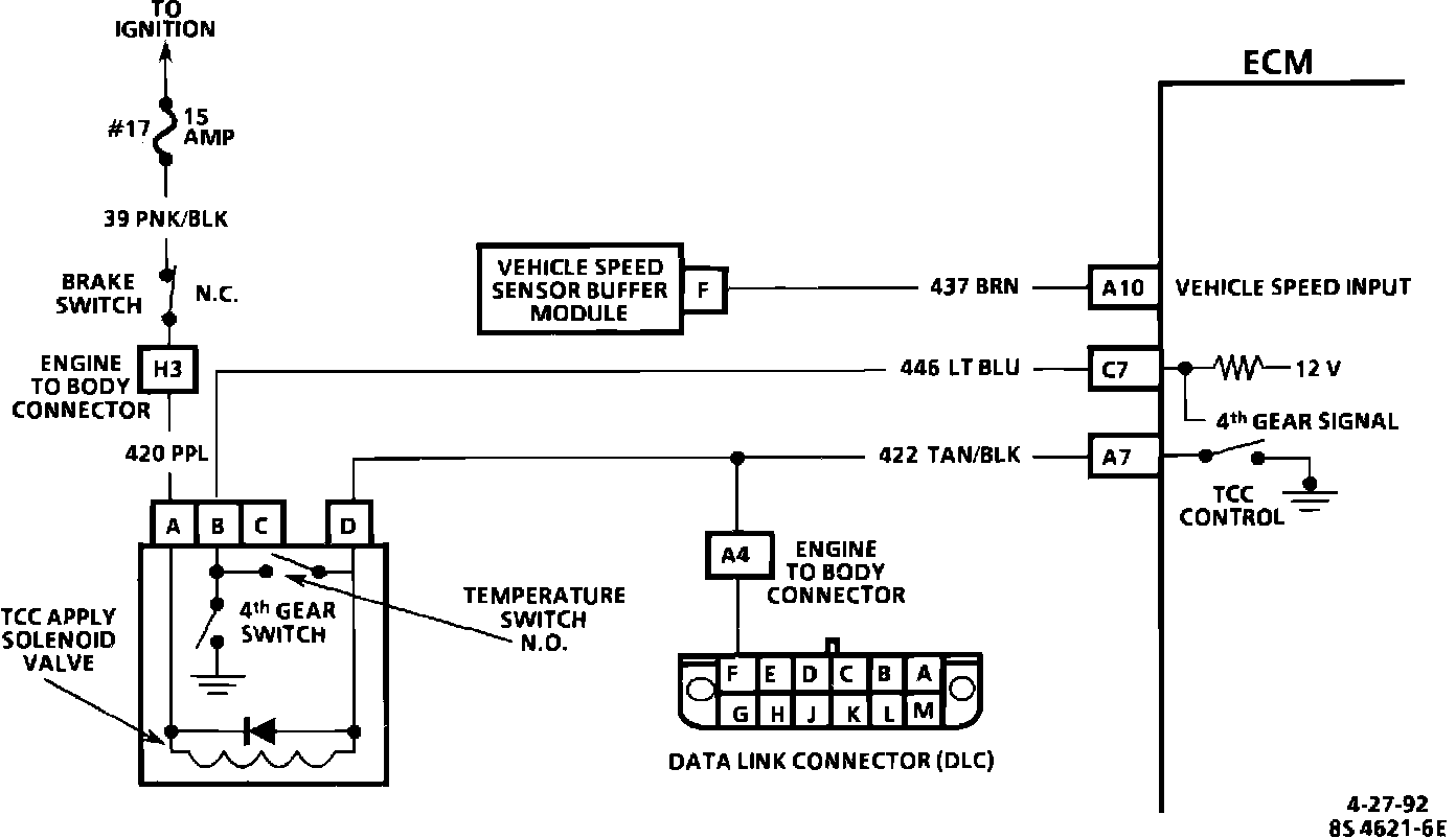 Ignition voltage is supplied to the TCC solenoid through the brake switch. The ECM will engage the TCC by grounding circuit 422 to energize the solenoid.
