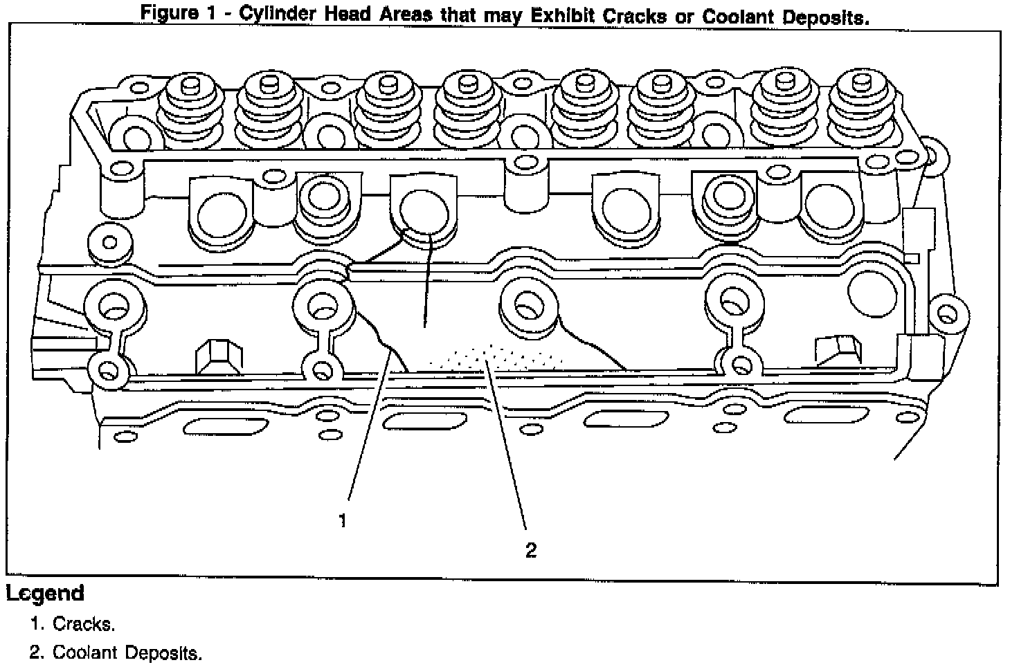 The cracking occurs in specific areas of the cylinder head and may leave a coolant deposit on the rear (exhaust side) of the cylinder head that may indicate leakage from these cracks. (See Figure 1)